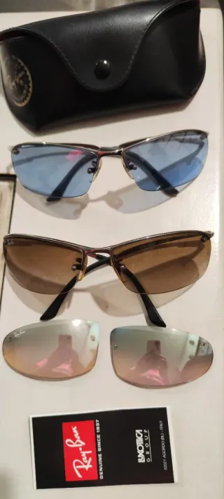 Conjunto de gafas de sol Ray-Ban con lentes intercambiables. - Lentes de color azul. - Lentes de color marrón. - Incluye funda protectora. Se venden juntas o por separado Precio de la unidad Descuento en el pack completo.