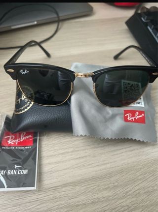 Gafas de sol Ray-Ban modelo Clubmaster. - Montura superior negra - Detalles metálicos dorados - Lentes verdes - Calibre 49/21 Poco usadas, impecables. La funda está un poco rajada en la parte del cierre, eso es lo único a destacar, se muestra en imagen, no tienen rayones ni marcas.