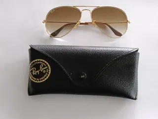 Gafas de sol Ray-Ban con un diseño icónico. - Montura superior en negro y detalles dorados. - Lentes oscuras. - Incluye funda protectora y paño de limpieza.