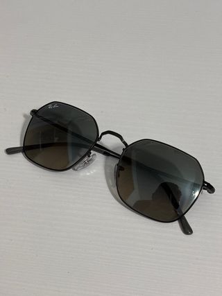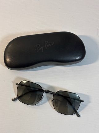 Gafas de sol Ray-Ban con montura negra y lentes negras. Usadas una vez. - Diseño octogonal. - Logo de Ray-Ban en la lente izquierda. Doy dos fundas y limpiador.