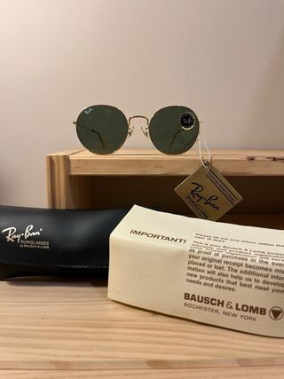 Gafas de colección Ray-Ban originales de Bausch & Lomb (U.S.A.). Modelo Round Metal en estado New Old Stock: totalmente nuevas, sin uso y de fabricación americana (años 90). El set incluye: Etiquetas originales: Conserva la etiqueta dorada de venta y el sello en el cristal. Ficha de garantía: Documentación de época de Bausch & Lomb (Rochester, N.Y.). Estuche original: Funda de cuero negro con el logo de B&L. Detalles técnicos: Montura: Chapada en oro (Arista Gold) impecable. Cristales: Lentes minerales G-15 con grabado láser BL y logo blanco. Grabado puente: "B&L RAY-BAN U.S.A. 52□21". Una oportunidad única!!