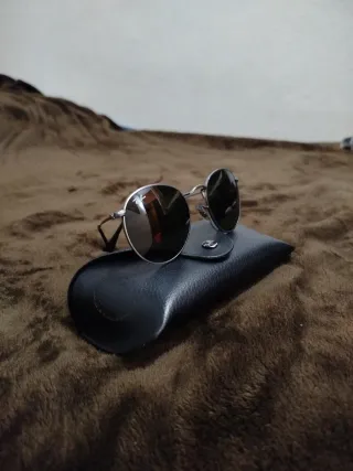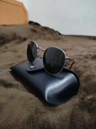 Gafas de sol con un diseño clásico y elegante. Modelo RB 3447 rind metal. Muy buen estado,prácticamente perfectas. - Montura metálica plateada. - Lentes oscuras redondas.