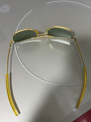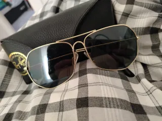 Gafas de sol estilo aviador con montura dorada y lentes verdes. Son las de tamaño 55, el más pequeño de este modelo. Los cristales están perfectos, sin rayones y la montura también está en muy buen estado. El estuche de Rayban está rajado.