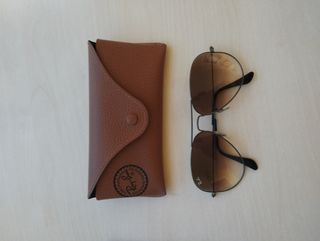 Gafas de sol Ray Ban para mujer, de color marrón. Son de estilo clásico y elegantes. Tiene una pequeñita marca en una lente. la funda está algo desgastada. - Montura de pasta. - Lentes marrones.