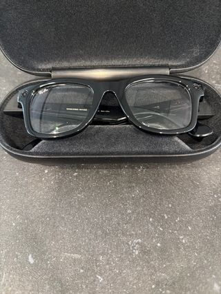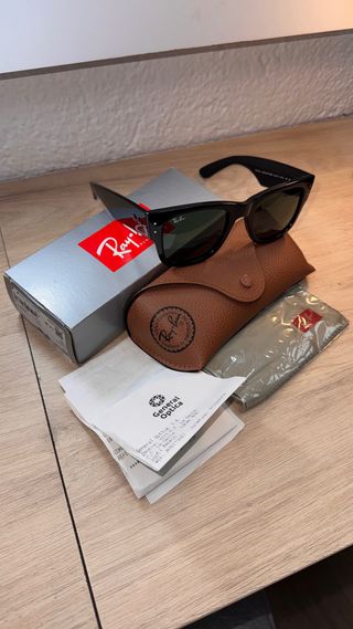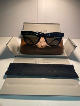 Gafas de sol Ray-Ban Meta Wayfarer. - Montura negra. - Funda de cuero marrón. - Caja original. - Tarjetas de seguridad y garantía. - Manual de inicio rápido.