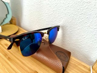 Gafas de sol Ray-Ban modelo Clubmaster con lentes de espejo azul. - Montura marrón tortuga. - Lentes con acabado espejo azul. - Incluye funda de cuero marrón.