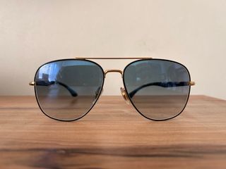 Gafas de sol Ray-Ban con un diseño icónico. - Montura superior en negro y detalles dorados. - Lentes oscuras. - Incluye funda protectora y paño de limpieza.
