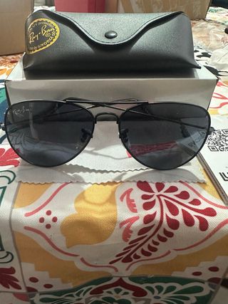 Gafas de sol Ray-Ban con montura negra y lentes grises. Incluyen funda. - Protección UV 400. - Lentes resistentes a impactos. - Ideales para uso general.