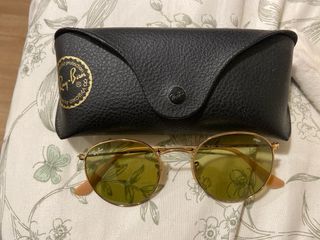 Gafas de sol Ray Ban de Bausch and Lomb USA, modelo Round Metal Oro YNAW, 125/46, cristales G15 B&L sin marcas ni rayones, montura en muy buen estado una de las patillas está ligeramente descolorida, con estuche Ray Ban de Luxotica