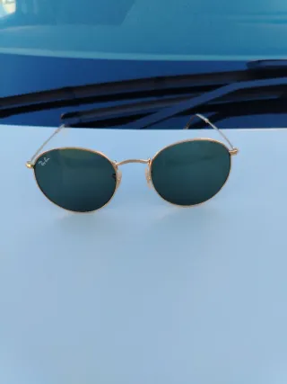 Gafas de sol Ray-Ban modelo Round Metal RB3447 con lentes polarizadas. - Montura metálica dorada. - Lentes polarizadas para mayor protección visual. Tiene pequeños rayones que solo puedes ver cuando los miras muy de cerca, son muy buenos de usar.