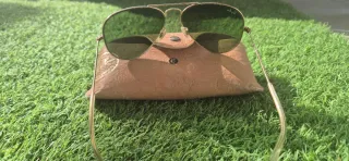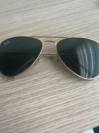 gafas de sol Ray-Ban Aviator originales, con montura dorada y lentes verdes clásicas. Modelo icónico, ligero y muy cómodo. 🔹 Estado: usadas, en buen estado general 🔹 Lentes en buen estado, sin rayones importantes 🔹 Montura metálica intacta 🔹 Almohadillas con signos de uso (ver fotos) 🔹 Incluye funda original Ray-Ban (con una pequeña grieta visible)