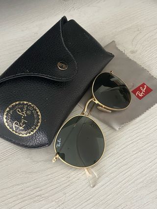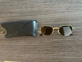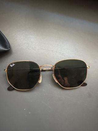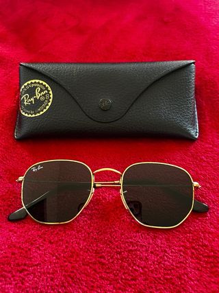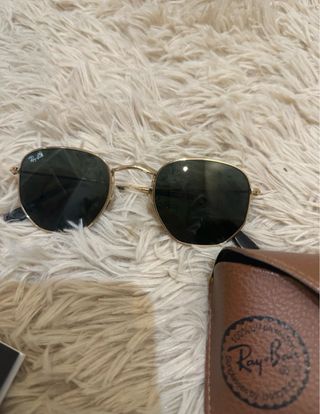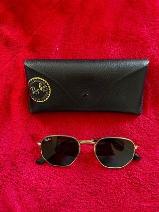 Gafas de sol Ray-Ban con montura dorada y lentes negras. - Diseño hexagonal. - Incluye funda y paño de limpieza originales. - Presenta un pequeño defecto ya que una patilla está un poco más elevada que otra. tiene fácil solución en una óptica. Ver última foto