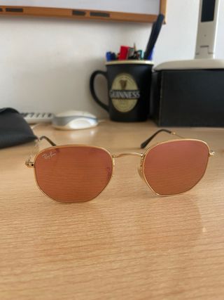 Gafas de sol Ray-Ban modelo RB3548N con montura dorada y lentes planas en tono rosa. El diseño hexagonal es moderno y llamativo. - Montura metálica dorada. - Lentes planas con tinte rosa. - Forma hexagonal. - Incluye estuche. No se han usado, tienen dos meses desde que se compraron adjunto factura. Precio algo negociable