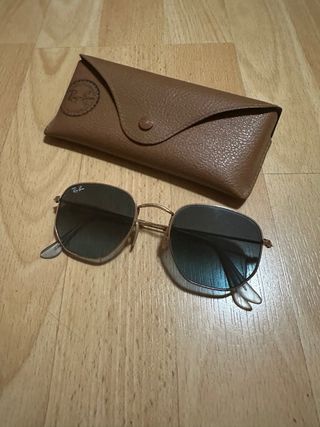 Gafas de sol Ray-Ban modelo Hexagonal. - Montura dorada. - Incluye funda de cuero marrón y paño de limpieza. - Talla 48•21 TOTALMENTE ORIGINALES se puede comprobar en el grabado del cristal