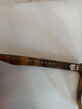 Gafas de sol Ray-Ban con lentes polarizadas. - Montura con diseño tortuga. - Lentes con tinte marrón. - Tiene un arañazo en el cristal (se ve en la primera foto al ampliar) pero no afecta en su uso.