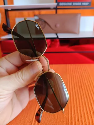 Gafas de sol Ray-Ban con un diseño hexagonal y montura dorada. - Lentes de color marrón. - Montura metálica dorada. - Incluye funda protectora.