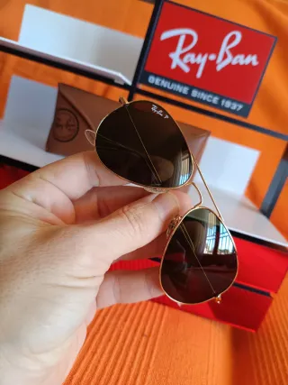 Gafas de sol Ray-Ban Aviator polarizadas originales y unisex, talla 55. Con un diseño clásico y elegante. - Montura metálica dorada. - Lentes polarizadas de color verde sin la más mínima señal ni rayada. - Estilo aviador. Precio no negociable. Se hacen envíos por wallapop y también entrega en mano en Barcelona, Terrassa y en Riells.