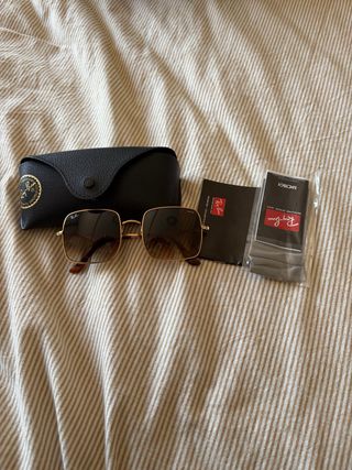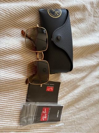 Gafas de sol Ray-Ban con montura cuadrada y detalles en dorado y marrón. - Incluye funda protectora. - Incluye paño de limpieza.