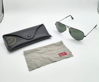 Gafas de sol Ray-Ban originales en muy buen estado. Cristales verdes clásicos, montura negra y dorada. Incluye funda y gamuza originales. Sin rayaduras visibles, siempre guardadas en su estuche. Se envían bien protegidas. Las patas de la gafas están un poco picadas pero no se ve y están en buen estado