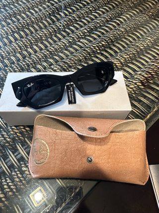 Gafas de sol Ray-Ban originales en color negro, con diseño elegante tipo cat eye. Lentes oscuras en perfecto estado, sin rayones. Montura resistente y cómoda. Incluyen funda original Ray-Ban de cuero marrón (con signos normales de uso, ver fotos) y caja. 🔹 Marca: Ray-Ban 🔹 Color: Negro 🔹 Estado: Muy bueno 🔹 Incluye: funda original y caja 🔹 Protección UV Ideales para un look sofisticado y atemporal. Se venden por no uso.
