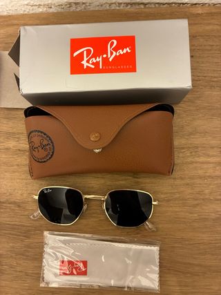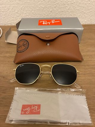 Se venden gafas de sol Ray-Ban modelo hexagonal. - Montura dorada. - Lentes negras. - Incluye funda y paño de limpieza.