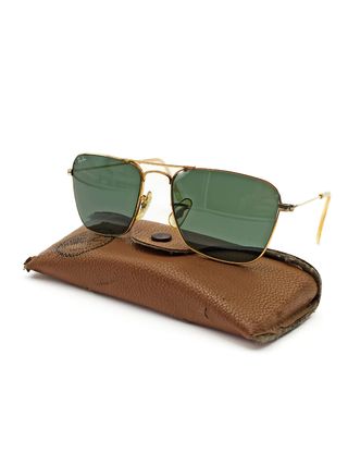 Occhiali da sole Ray-Ban modello Caravan, con certificato di autenticità. Con segni di uso come in foto. - Montatura color oro. - Lenti verdi. - Custodia inclusa.