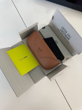 Gafas de sol Ray-Ban con tecnología de cámara integrada. Incluye funda protectora y manuales. - Funda de color marrón. - Incluye folleto OPTICA2000. - Mensaje LISTEN. CALL. LIVESTREAM. en la caja. Gafas Ray-Ban Meta completamente nuevas, nunca conectadas al teléfono. Incluye caja original, funda marrón y todos los manuales.
