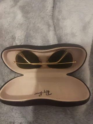 Gafas de sol estilo aviador con montura dorada y lentes oscuras. Se venden con su funda de cuero marrón. - Cristales con marcas de uso y algunos arañazos. - Montura metálica dorada. - Incluye funda de cuero.