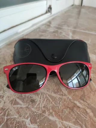 Gafas de sol Ray-Ban con montura roja. Modelo New Wayfarer 55/18, lentes 3N. Muy bien cuidadas. La funda presenta algunos desperfectos por el uso, tal y como se ve en la foto.
