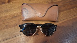 Gafas de sol Ray-Ban Clubmaster en excelente estado, casi nuevas. Un accesorio icónico con un diseño atemporal y con la funda original hay foto de las bisagras de las patillas para que se vea que estan perfectas Tambien ahi pone lugar de fabricación y el modelos y codigos - Montura combinada en negro y detalles dorados. - Lentes oscuras con reflejos. - Incluye funda protectora.