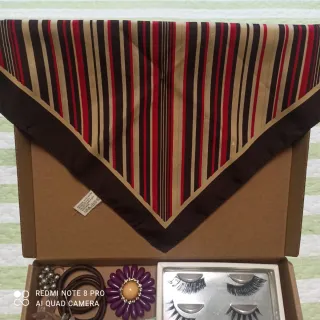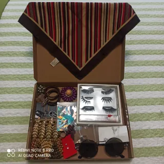 Conjunto variado de bisutería y complementos. - Pañuelo estampado con rayas verticales. - Set de pestañas postizas. - Broche de flor morada. - Varios pares de pendientes. - Pulseras y gomas para el pelo. - Adornos con forma de hoja dorada. - Gafas de sol redondas. - Soporte para el móvil. - Pinzas de pelo...