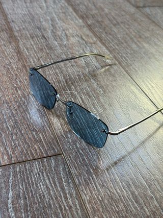 Gafas de sol de estilo vintage con un diseño moderno. - Montura metálica oscura. - Lentes transparentes con tinte grisáceo. - Patillas finas y transparentes.