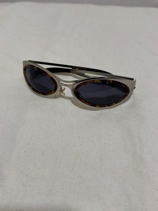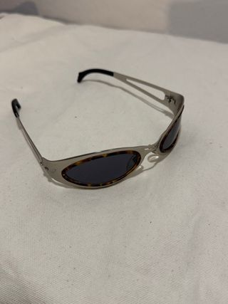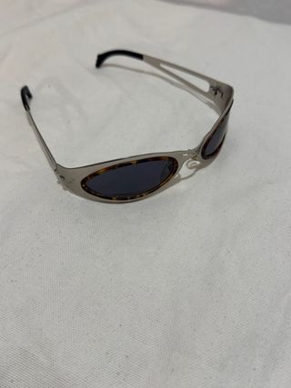 Gafas de sol estilo Y2K con montura metálica y detalles carey. - Diseño futurista y atrevido. - Lentes oscuras para protección. - Patillas finas y cómodas.