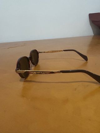 Espectaculares gafas de sol de los años 80/90 del diseñador japonés Matsuda. Una pieza de coleccionista extremadamente difícil de encontrar, famosa por su estética industrial y futurista. Origen: Hechas a mano en Sabae, Japón. Detalles: Protectores laterales metálicos calados y varillas con detalles geométricos grabados. Diseño: Estilo ovalado con montura combinada de acetato y metal dorado. Estado: Vintage en muy buen estado (ver fotos). Al ser una pieza de archivo, las marcas del interior se han desvanecido con el tiempo. Una pieza de culto similar a las utilizadas en producciones de cine como Terminator 2. Escucho ofertas