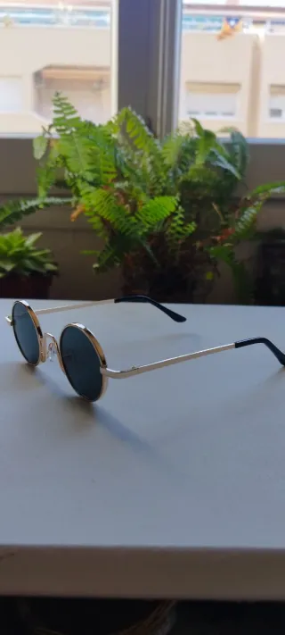 Gafas de sol con un estilo retro y un diseño circular. - Montura metálica dorada. - Lentes verde oscuras para el cuidado de tus ojos - Patillas negras.