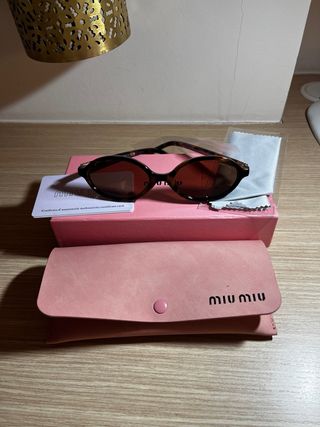 Gafas de Sol Vintage de la Prestigiosa y Exclusiva Marca MIU MIU en muy buen estado con su funda, montura y lentes Marrones , no se ve las letras pero la talla es una 60. Distancia entre patillas 13,7cm cada lente mide 5,9cm..