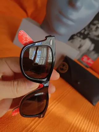 Gafas de sol Ray-Ban modelo Wayfarer folding con un diseño clásico y atemporal. El color marrón le da un toque distintivo. Gafas plegables sin su estuche cuadrado, se entrega con una funda normal de gafas. - Montura de acetato. - Lentes rayados con degradado. - Logo de Ray-Ban en las patillas. Se hacen envíos por wallapop y también entrega en mano en Barcelona, en Terrassa y también en Riells i Viabrea.