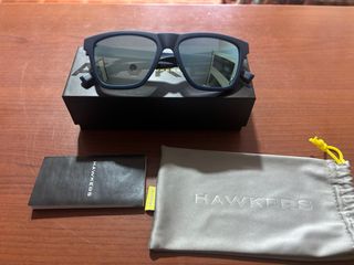 Gafas de sol Hawkers en azul y plata, prácticamente nuevas. Ideales para protegerte del sol con estilo. - Montura cuadrada. - Lentes con reflejo plateado. - Incluye funda protectora y manual.