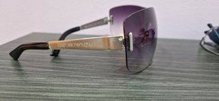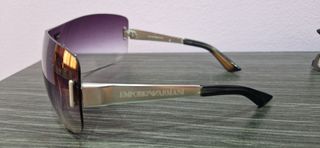 Gafas de sol Emporio Armani con un diseño moderno y elegante. - Lentes degradadas en tono morado. - Montura metálica plateada. - Varillas negras.