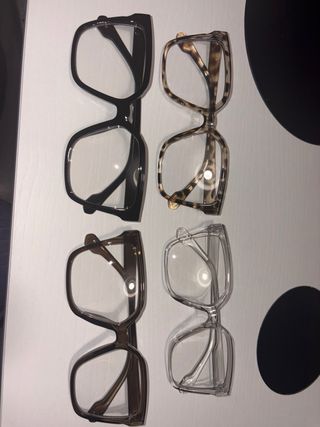 Pack de cuatro gafas de pasta con monturas de diferentes estilos y colores. - Montura negra. - Montura translúcida gris. - Montura transparente. - Montura estilo carey. ( Incluye toallita)