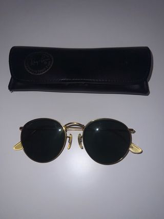 Gafas de sol RayBan redondas, con montura dorada y lentes verdes. Se incluyen las gafas y su estuche original. - Lentes oscuras. - Estuche original RayBan.