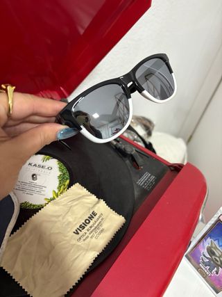 Funda original de la marca "Oakley". Rígida, con fleje. Nueva, sin usar. Incluye funda tipo bolsa de tela con cierre de cordón y caja de cartón con el logotipo de la marca.