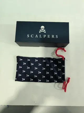 Funda para gafas de la marca Scalpers. Presenta un diseño con calaveras blancas sobre fondo azul marino. SIN GAFAS - Cierre con cordón. - Estampado de calaveras.