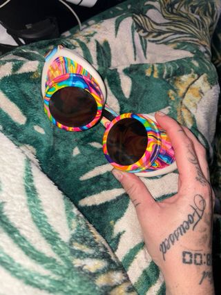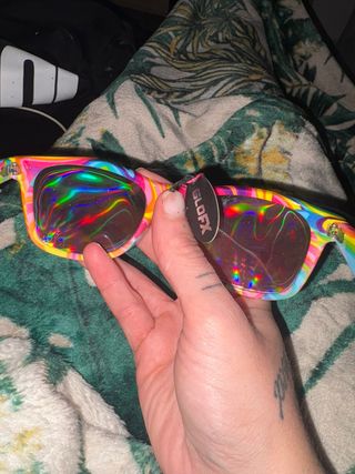 Gafas con un diseño llamativo y psicodélico, perfectas para festivales y eventos. - Montura con patrón de remolino multicolor. - Lentes con efecto prismático y de caleidoscopio. - Incluyen etiqueta de la marca Glofx.