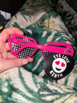 Gafas con efectos especiales para festivales y raves. - Diseño de lente facetada. - Montura rosa. - Detalle Eye Love Ibiza en la montura.