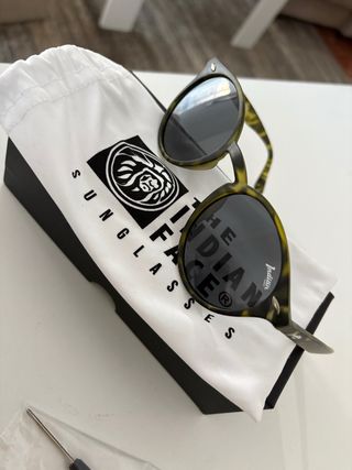 Gafas de sol Indian Face con un diseño único. - Montura con acabado carey en tonos verdes. - Lentes oscuras. - Incluye funda protectora.