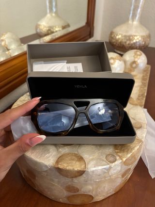Gafas de sol VEHLA River Vesta con montura negra y lentes verdes. Se entregan en su estuche original. - Montura de acetato. - Lentes con protección UV. - Diseño moderno y elegante. el precio es de 200 en su página web