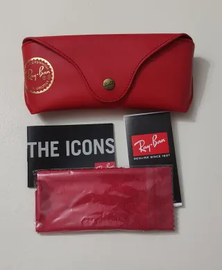 Funda original de la marca "Ray-Ban". Para gafas de sol iconos de la marca. Rígida, con cierre de broche. Nueva, sin usar. Incluye gamuza original para limpiar las gafas y caja de cartón con el logotipo de la marca.