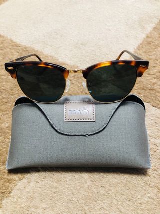 Gafas de sol RayBan Clubmaster con su funda - Montura superior negra. - Detalles metálicos dorados. - Lentes oscuras.