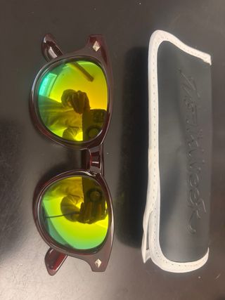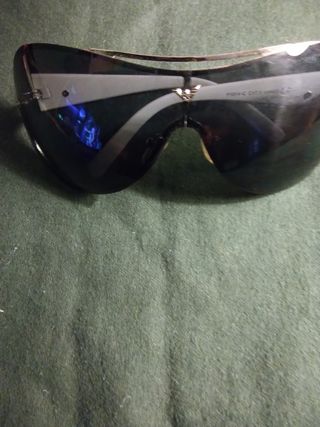 Gafas de sol con lentes de espejo. - Montura espejo gris oscuro. - Lentes plateadas y patillas azules. con funda ( con dos manchitas como se ve en la foto de haber estado en el armario ) y pañuelo limpia cristales